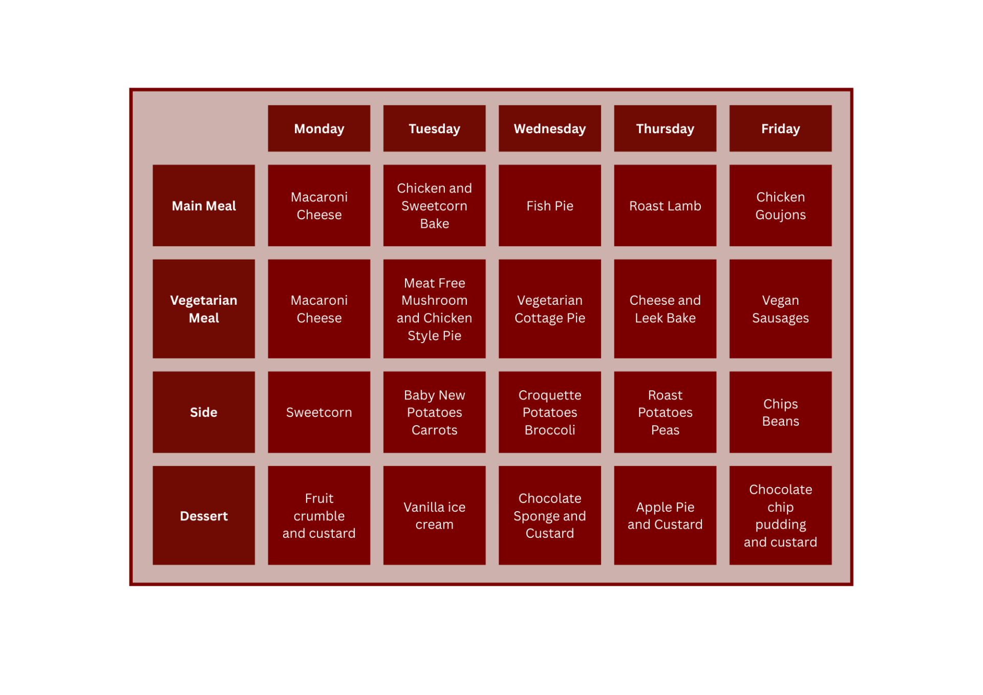 We follow a four-week seasonal menu, featuring a variety of delicious main dishes, sides, and desserts.