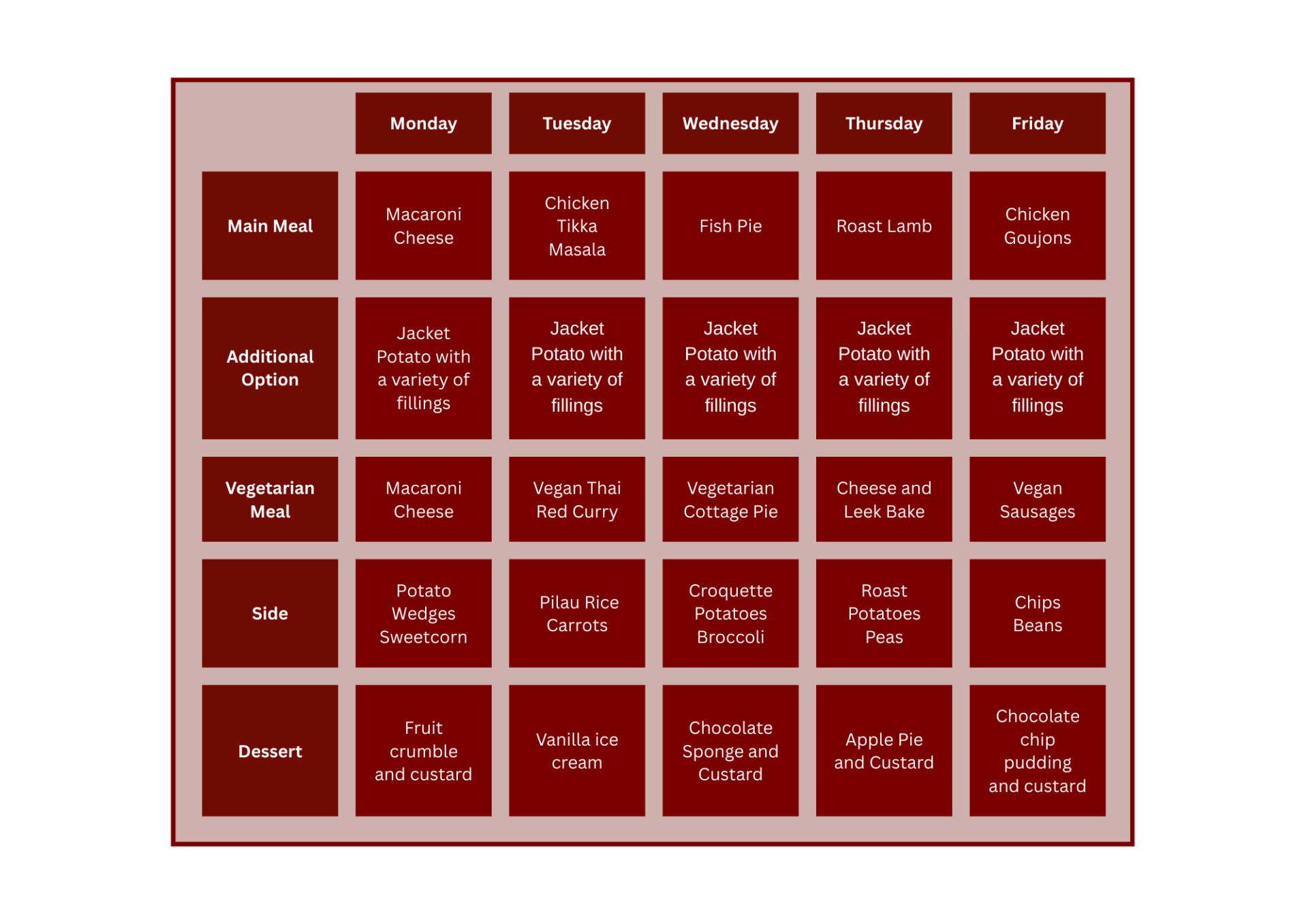 The menu is shaped by pupil choice, and we cater for individual dietary needs to ensure every child is included. For those who prefer something different, a jacket potato with a choice of fillings is available daily. In addition to lunch, we also offer a continental-style breakfast with cereals, toast, and a daily special such as baked beans on toast, croissants, or pancakes. During the colder months, porridge is also on the menu to provide a warm, comforting start to the day.